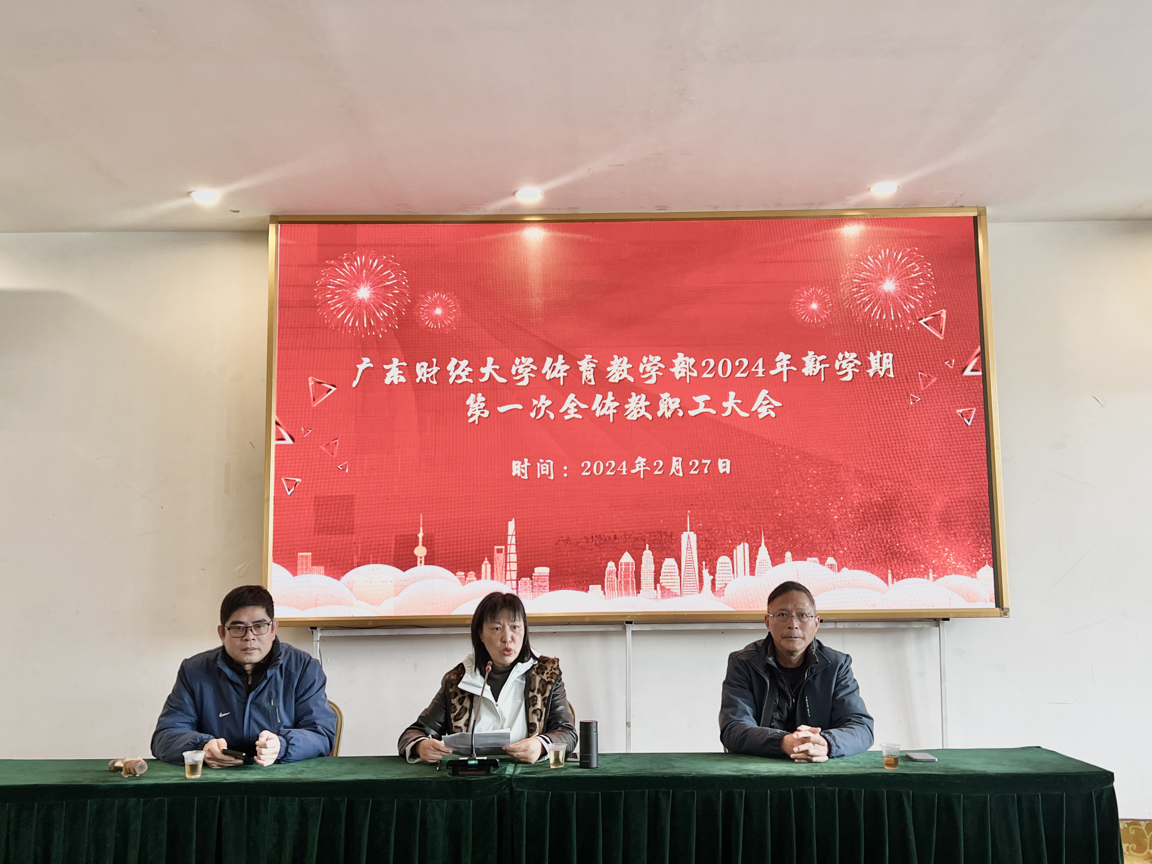 蔡建辉结合2024年重点工作,提出部门在“人才培养、学科建设、群体竞赛”三个方面发展目标;在“服从部门工作安排、营造风清气正的氛围、积极主动干好本职工作”三个方面对教职工做具体要求,并对教职工提出三个愿望。谢玉波对新学期课程教学、场地器材、课堂纪律等各项准备工作进行部署。